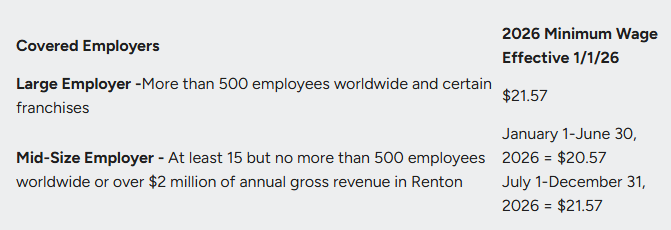 Effective January 1st, 2026, Tukwila Minimum Wage hourly rates will be $21.65.